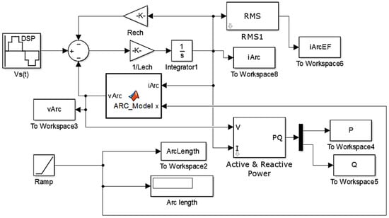 Using Equations (12), (13), and (15), we obtained a Simulink model for simulating the electric supply system of an electric arc furnace for a single phase, as illustrated in Figure 2.
