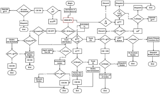 If the LNP for beacon nodes are dispatched, then it is turned On. If the allocated node is less than the deallocated node, the (fitness function) [37] starts working to explore other criteria options for CB. Otherwise, it again starts to continue allocating more nodes as required. This study considered SON of beacon if the allocated or deallocated nodes are empty. This process continues until the does not stop to explore other nodes. For the Bunit operation, it directly depends upon the neighboring list of primary nodes. For the , it depends upon the sub-structuring of all related beacon nodes to meet the allocated criteria. In our scenario, two cases are considered as the is directly applied to all neighboring nodes or only applied when a node is sent through a proper channel as described in and , respectively. The symbols used in equations and their acronyms are listed in Table 1.