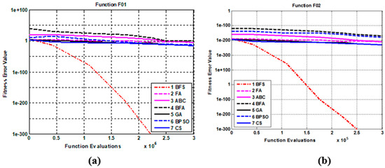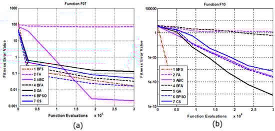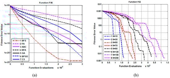 The comparison across the algorithms (GA, BFS, FA, ABC, CS, BPSO, BFA) in plot (a) reveals that BFS is the most efficient algorithm in terms of quickly reaching the lowest fitness error value. The other algorithms, FA and ABC, converge slower, indicating less optimal performance for this function. The different parameter configurations (e.g., N = 10, N = 30) influence the convergence rate of the fitness error values. Smaller configurations (e.g., N = 10) converge faster initially, but larger configurations like N = 150 or N = 200 take longer to improve the solution.