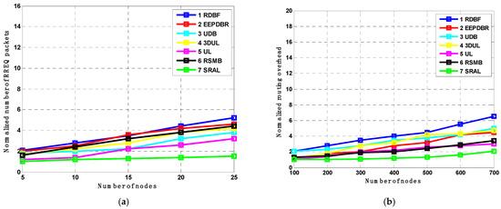 In Figure 6a, for route discovery, the performance metrics directly affect the performance of the optimization method. With increasing forwarding, the RREQ is directly meant to increase the node density. For example, RREQ propagation is not restricted by the routing scheme; it may be propagated to those areas that are far from the destination nodes. Therefore, to re-ensure the node’s availability and its accurate position, the flow of RREQ increased.. On average, RREQ will decrease by 10% for the proposed scheme compared to a 2% increase for EEPDBR, along with an increase of 6% UDB, 4.5% 3DUL, 4.1% UL, and 3.9% RSMB schemes, respectively. Under some constraints, it will further decrease by more than 10% compared with EEPDBR. Consequently, from the result, we determined that both SRAL and RDBF can significantly reduce the normalized numbers of RREQ against the different density of nodes. Moreover, the traditional gossip protocol shows that for the normalized number of RREQ packets, the information with varying numbers of nodes from all observing techniques like RDBF, EEPDBR, UDB, UL, 3DUL, and RSMB.