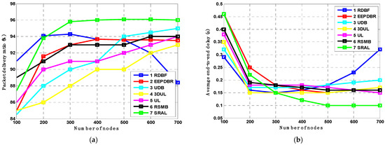 The Packet Delivery Ratio (PDR) for RDBF, EEPDBR, and the proposed SRAL scheme is shown in Figure 7a. It is evident that EEPDBR and SRAL exhibit a bend in their curves when the number of nodes is around 75. At this point, RDBF achieves a PDR of 89.2%, but as node density increases, the PDR drops to 88%, showing a declining trend. This decrease in PDR is characteristic of RDBF, reflecting the negative effect of higher node density. In this analysis, we did not account for the impact of dead nodes in our implementation.
