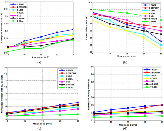 The maximum speed analysis is conducted across different schemes, observing similar reactions in node mobility and the corresponding RREQ and RO ratios in Figure 8c,d. Each scheme exhibited varying behaviors; for example, RDBF and EEPDBR achieved control ratios of 21% and 27%, respectively, while UDB reached 19.6%, UL reached 15%, 3DUL reached 17%, and RSMB reached 22%. The proposed scheme, however, maintained a significantly lower control ratio of only 15%. Despite variations in node mobility speed, all routing schemes successfully managed RREQ, RO, and enhanced PDR in a structured manner, as shown in Figure 8c. However, protocols EEPDBR and SRAL effectively limit this range and show a decreasing trend compared to RDBF, UDB, 3DUL, UL, and RSMB. EEPDBR and SRAL exhibit reductions of 76.2% and 79.5%, respectively, compared to RDBF and especially UL. Under the same network conditions, these protocols show only a 2–4% increase. The normalized RO, as shown in Figure 8d, which includes RREQ, RREP, WFA, and RERR packets, demonstrates a significant reduction in RO for both EEPDBR and SRAL. As discussed in Figure 8c, the normalized number of RREQ for these protocols is reduced, leading to more than a 50% reduction in RO compared to RDBF and a 45% reduction compared to EEPDBR. Under the same network conditions, RDBF continues to increase with the rising maximum speed of up to 25 m/s, while EEPDBR and CGDBLR maintain close performance, likely due to their restricted RREQ range, contributing to the control of RO across RDBF, UDB, 3DUL, UL, and RSMB.