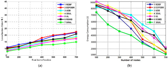 Figure 9a illustrates the localization error for all studied protocols, showing that as the network stability decreases with an increase in node speed, the PDR also declines. Despite this, the proposed SRAL protocol successfully restricts the maximum number of RREQs, ensuring that increased node density does not negatively impact performance. Furthermore, SRAL improves PDR through enhanced routing path stability. By reducing the number of RREQs, the likelihood of packet collisions decreases, ultimately enhancing PDR and minimizing localization error. Notably, SRAL achieves approximately 97% accuracy in reducing localization error, outperforming EEPDBR and RDBF, which show 2% higher localization errors as node density increases up to 500 nodes. In contrast, RDBF experiences a 21% reduction in PDR, while EEPDBR shows a 6% drop in PDR as network density and speed approach their limits. At a node count of around 400, which represents a mid-sized network, the localization errors for RDBF, EEPDBR, UDB, 3DUL, UL, and RSMB are 21%, 27%, 19.6%, 17%, 15%, and 22.2%, respectively. In contrast, the proposed SRAL only increases by 15% with the error continuing to decrease as the network size grows.