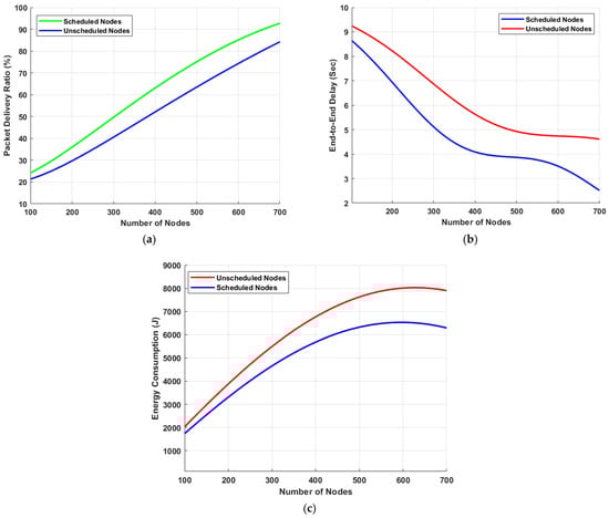 Impact analysis of (a) Packet Delivery Ratio; (b) End-to-End delay; and (c) energy consumption for scheduled and unscheduled nodes in network.