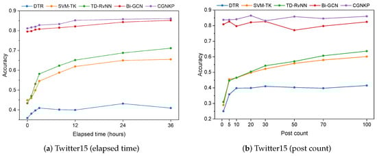 Identifying rumors in the early stages of propagation is crucial for effectively curbing their spread. Early detection enables relevant authorities to take prompt action, thereby enhancing public safety and mitigating the negative impact of rumors on society. We will now examine the performance of early rumor detection by comparing the detection accuracy of different models across various elapsed times and post counts [33]. The sooner the model detects the rumor, the less information it has to work with. We assess its performance based on the accuracy achieved at specific checkpoints. Figure 5 shows the comparison of CGNKP and the baseline models in terms of early detection performance.