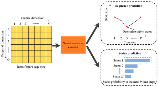 The essence of ROR risk prediction is time series forecasting, which requires establishing a mapping relationship between input and output through neural networks. Let the input feature sequence be denoted as X = {x (1), x (2), ……x (C)}, where C represents the number of features. Assuming the length of the feature sequence input during the observation window is O, and the prediction sequence window is P. As shown in Figure 1, for the sequence prediction, the modeling problem can be expressed as establishing a mapping from XtO+1:t = {x (1), x (2), ……x (C)} ∈ ℝC×O to Yt+1:t+P ∈ ℝP. When there are K ROR risk statuses, the risk level within the next P time steps can be determined by identifying the extreme value of ROR risk within the prediction window. This approach maps multi-step predicted risk values to safety levels. For the status prediction, the modeling can be described as establishing a mapping from XtO+1:t = {x (1), x (2), ……x (C)} ∈ ℝC×O to Y ∈ ℝK, where the Y vector represents the probability of the risk statuses, with the highest probability representing the predicted status (Status marked by green dashed line).