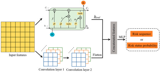 As previously mentioned, network combinations are a common application method in current deep learning models. This study employs a parallel combination of LSTM and two-dimensional CNN models for ROR risk prediction [37]. As illustrated in Figure 2, LSTM and CNN are initially used to extract driving feature information separately. The information extracted from the two networks is then concatenated to maximize the preservation of feature integrity. Finally, the MLP is used to decode the feature information to obtain the prediction results. In sequence prediction tasks, the output comprises the risk sequence projected for a specified prediction time window. In status prediction tasks, the output delineates the probability of occurrence for each risk status.