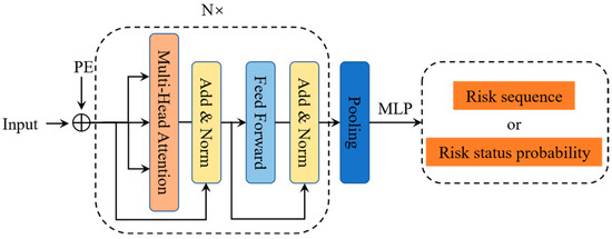 The Transformer is the mainstream architecture currently applied in the field of deep learning, with its core innovations lying in the integration of Positional Encoding (PE), residual connection techniques [40], and multi-head attention mechanism. Considering that this study is focused on short-term prediction, only the encoder from the Transformer is used for encoding driving features. The model structure is shown in Figure 4 [41]. Firstly, a learnable positional encoding matrix is used to encode the positional information of the input sequence. Then, the multi-head attention mechanism is employed to enhance feature information, followed by the residual connection and feedforward neural network. After stacking N modules, pooling operations are performed, and the final prediction results are obtained through MLP.