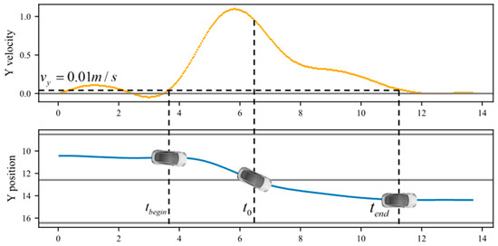 Step 2: The LC moment t0 was determined first. Then, the moment from t0 forward search to a lateral speed of 0.01 m/s is the end of the LC (tend). The moment from t0 backward search to a lateral speed of 0.01 m/s is the beginning of the LC (tbegin). The LC duration is [tend, tbegin].