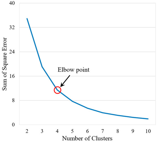 where Ci represents the ith cluster, p represents the samples belonging to cluster Ci, and mi indicates the center of the ith cluster. With the increase of the clusters, the SSE will decrease as the reduction of inter-cluster error. When the clustering error does not significantly decrease with an increase of the clusters, the optimal clustering number is determined, and this method is known as the elbow method [33].