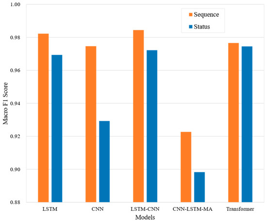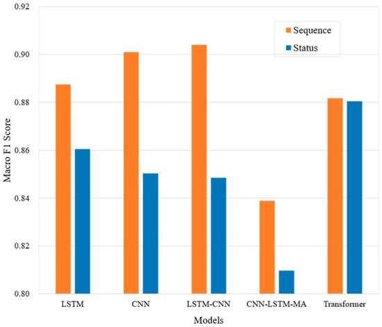 The average MFS for each model under sequence prediction and status prediction is presented in Figure 7. The overall predictive performance of each model in sequence prediction is superior to that in status prediction. With the exception of the Transformer, which demonstrates similar predictive performance in both modes, the average MFS for the other four models in sequence prediction exceeds that of status prediction by 3.13% to 6.54%. This indicates that sequence prediction outperforms status prediction in terms of prediction precision. Among the models, LSTM-CNN achieves the best average predictive performance for sequence prediction, followed by CNN and LSTM. Although the Transformer significantly outperforms other models in status prediction, its status prediction performance remains a noticeable gap compared to the sequence prediction of LSTM-CNN, CNN, and LSTM. Despite the application of model combination and the multi-head attention mechanism, CNN-LSTM-MA performed the worst among the five models. This suggests that the combination of the serial structure of CNN and LSTM with the multi-head attention mechanism did not yield a positive gain in model performance. It also reveals that stacking models and advanced technologies does not necessarily enhance model performance.