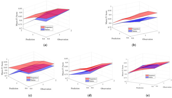The MFS significantly declines as the prediction window increases. When the observation window is set to 2 s and the prediction window to 0.6 s, the MFS for all models in sequence prediction exceeds 0.9. However, when the prediction window is extended to 2 s, the highest MFS observed in sequence prediction is only 0.858 (CNN with a 2 s observation window). A similar trend is observed in status prediction, where the MFS decreases noticeably with the increase in the prediction window. This trend aligns with the general understanding that the difficulty of time series prediction increases with the length of the prediction window.