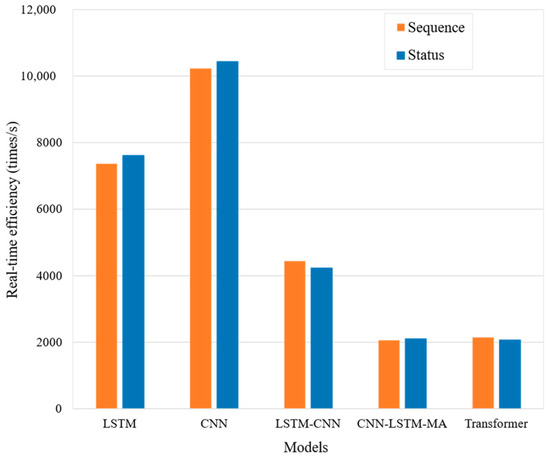 In addition to prediction precision, the efficiency of model operation is crucial for real-time risk prediction. To fairly assess the efficiency of different prediction approaches, both sequence and status prediction models were configured with the same structural parameters. With both observation and prediction windows set at 2 s, the number of predictions performed per second was recorded, and the average results for 10 runs are shown in Figure 9. The test results indicate that there is no significant difference in performance between sequence and status predictions. Although sequence prediction theoretically involves a slightly larger number of model parameters due to its more extensive output counts, experimental results indicate that these minor differences do not significantly impact the model’s execution efficiency. In the LSTM, CNN, and CNN-LSTM-MA models, status prediction slightly outperforms sequence prediction in terms of efficiency, whereas sequence prediction is more efficient than status prediction in LSTM-CNN and Transformer. This variation is mainly attributed to the randomness in hardware performance during execution.