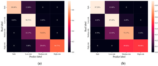 Figure 10. Confusion matrix of CNN under 2 s observation and 2 s prediction window: (a) sequence prediction; (b) status prediction.
