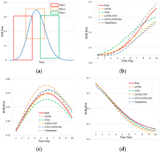 The sequence prediction models’ results for the rising, turning, and declining phases of ROR risk are shown in Figure 11b–d. The results indicate that all five prediction models accurately forecasted the continuous upward trend of ROR risk. Except for the LSTM model, which predicted the highest risk level as Low-risk for the upcoming 2 s, the other models predicted the risk status correctly. The turning points of risk contain two critical information: the risk degree and the risk transition moment. On one hand, the sequence prediction models accurately predicted the safety status at the risk extremum. On the other hand, they identified the risk turning point approximately 1.2 s in advance (each time step being 0.2 s), providing additional valuable information for driving safety. Simultaneously, the sequence prediction models also accurately captured the sequence trend where the ROR risk declined.