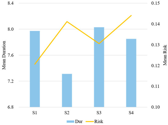 To further study the influence of interaction information, the lane change (LC) duration and mean risk of different situations are also discussed. The situations are determined by the presence or absence of four surrounding vehicles. There are mainly four LC situations: 211 pre and t_pre (S1); 66 pre, t_pre, and fol (S2); 121 pre, t_pre, and t_fol (S3); 195 all four vehicles (S4). The average LC duration and risk of these situations are shown in Figure 12. As the duration and risk do not follow a normal distribution, the Kruskal-Wallis H test is applied to assess the differences among situations. The duration and risk in different situations show significant differences (duration: H = 17.177, p < 0.001; risk: H = 17.103, p < 0.001), and the Bonferroni multiple comparisons reveal significant differences in the duration of S2–S3 (p = 0.012), S2–S1 (p = 0.004), and S4–S1 (p = 0.042), and in the risk of S1–S4 (p < 0.001). The main difference among the situations is the presence of the following vehicle in the original and target lanes. The duration difference in S2–S1 and S2–S3 indicates that the following vehicle in the original lane would prompt the LC process, and the duration and risk difference in S1–S4 suggests that the increase of following vehicles will increase the risk of near-roadside LC while accelerating the LC process.