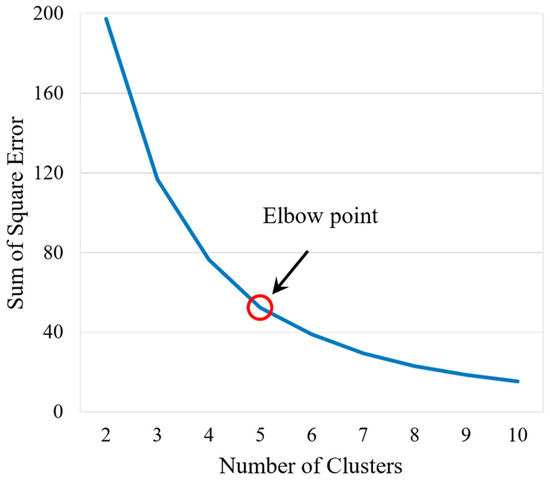 The number of cluster centers needs to be specified before clustering. The optimal number of clusters can be determined by observing changes in clustering error as the number of clusters varies. The Sum of Squared Error (SSE) metric is used to assess the sum of the squared distances from all samples to their corresponding cluster centers (Equation (2)).