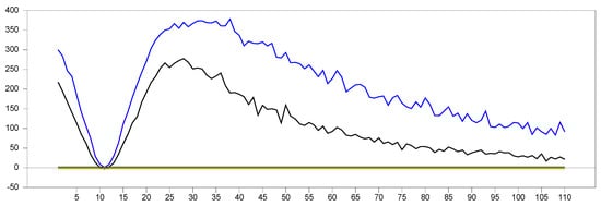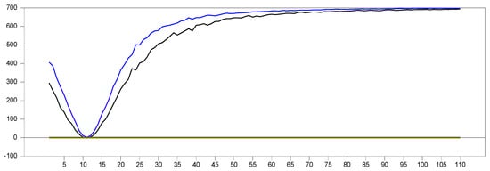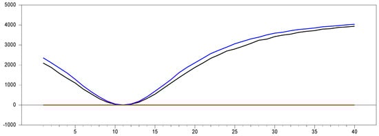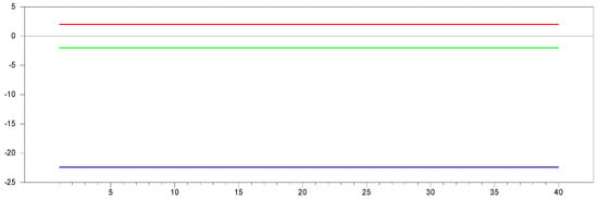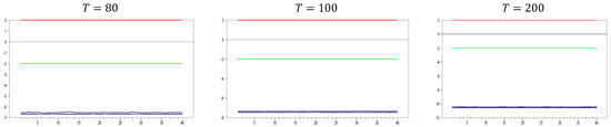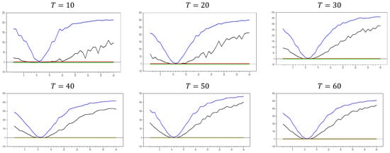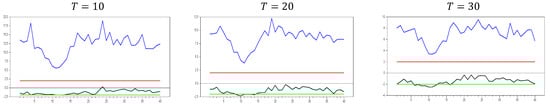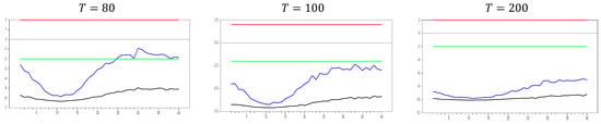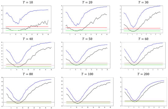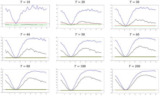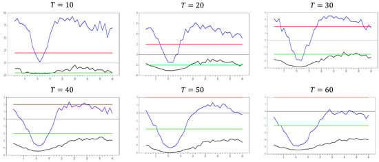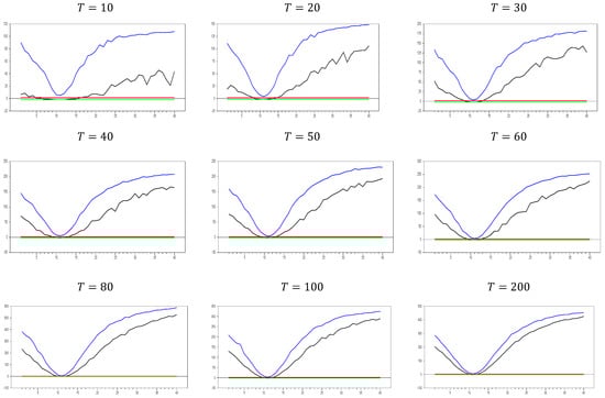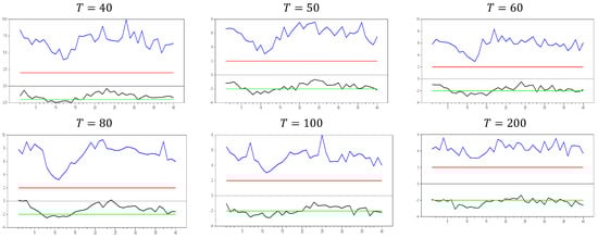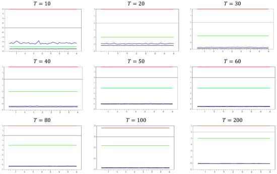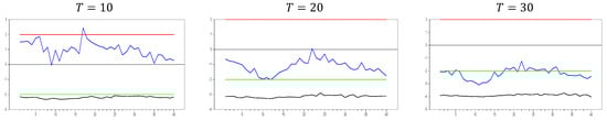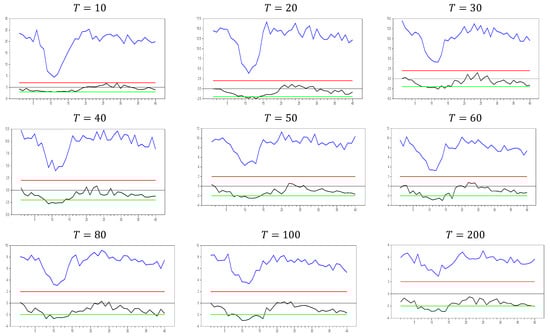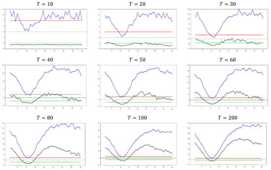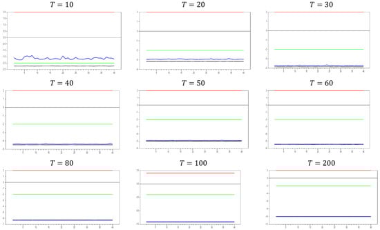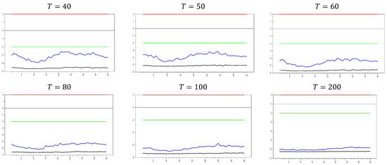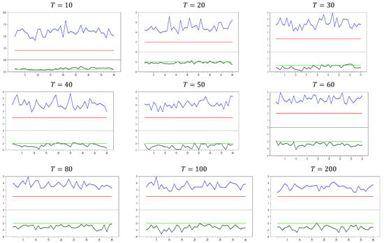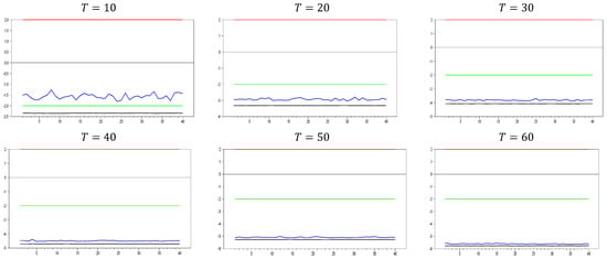 Figure 13 clearly demonstrates that, for small  values, the newly proposed estimator or proxy closely mimics the original factor variable. Specifically, for  and , the new proxy closely replicates the original factor variable based on the  test results shown in Figure 5. However, as the  dimension increases, both the minimum and maximum  test values rise, and the band widens. By , the  test results for the proxy estimator indicate that it no longer provides an effective remedy. To further examine the effect of increasing the  dimension, we performed a simulation for . The results are shown in Figure 14. Figure 14 shows that the effectiveness of the newly proposed estimator in remedying CSD diminishes as the  dimension increases. Thus, we can conclude that this proxy is only effective for very small  dimensions.