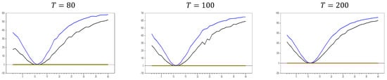 As shown in Figure 1, the  test effectively captures CSD for . The test becomes more sensitive as the  dimension increases. This can be observed in the figures, where for , the maximum  test value approaches 20.0, while for , it increases to around 50. A similar pattern is seen for the minimum values. As  increases, the initially u-shaped  test results become skewed, with the tangency points of the curve shortening. This indicates that the  test detects CSD for smaller factor loadings as  grows. For , the range of test statistics is approximately (0.1, 0.4), indicating almost no CSD, while for , the range is wider at (−1.0, 2.4). These results suggest that it is not straightforward to categorize the range (0.0, 0.2) as weak CSD, as some effects are still present when  increases. However, our primary goal is to confirm whether the  test is working or not. Based on Figure 1, we conclude that it works well for small  values.