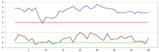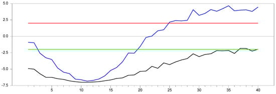 test results without remedying the CSD data for . Note: In the figure, point 10 in the x-axis is 0.0 factor loading and the y-axis shows the  test results. The 10 percent significance interval is given as −2.0 and 2.0 as an approximation to −1.96 and 1.96. Moreover for clarification, blue line is the upper bound of the  test which is obtained for that specification and the black line is the lowest  value obtained for that parameter specification. As for every factor loading we have done simulation study the obtained lower and upper bounds are results from these simulation studies. Green line and red line explained above as −2.0 and 2.0, respectively.