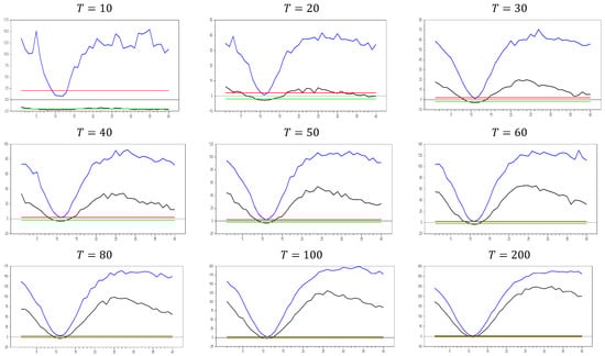 In Figure 11, we observe that the results are similar to those in Figure 9 and Figure 10. The only difference is that for  and , no band appears, and the minimum and maximum values are fixed at 10.0. This indicates that the bands in Figure 11 are narrower than those in Figure 9 and Figure 10. To further explore the behavior in large samples, we conducted a simulation for  and .