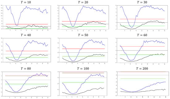 We now move on to test the performance with a larger  value, selecting , and the corresponding results are given in Figure 2. As shown in Figure 2, the pattern observed is consistent with that in Figure 1. This confirms that increasing the  dimension does not cause any issues with the  test results. Therefore, these simulation results provide evidence of the test’s consistency in small samples. As the  dimension increases, both the maximum and minimum values of the  test also increase. For example, with  and , the maximum  test value approaches 20.0, but for  and , this maximum value rises to approximately 100.0. Similarly, for 0 and , the maximum value is around 50, while for  and , it increases to 450.0. A similar pattern is observed for the minimum values. Furthermore, as the  dimension increases, the tangency points of the u-shaped figure become shorter, indicating that the  test detects CSD for smaller factor loadings.