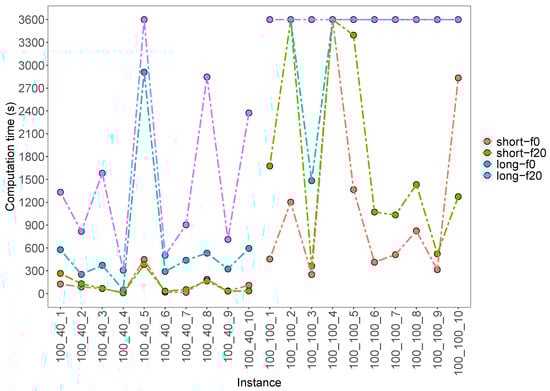 Table 4, fewer problems are solved to optimality, as expected. The time limit is reached in 22 out of 40 instances. In the short-length setting, 17 out of 20 instances are solved, with the remaining three showing a gap between 0.97% and 3.13%. In the long-length setting, only one instance is solved, with the remaining 19 showing gaps between 0.32% and 11.20%.