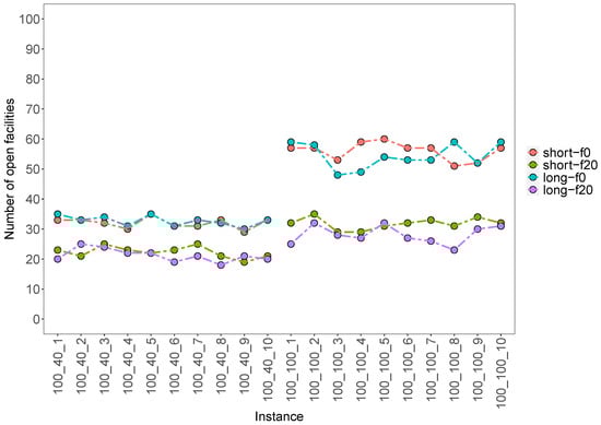 Figure 3 shows the number of open facilities (with lines broken to distinguish between the two blocks of instances). As expected, more facilities are open when the number of facilities is 100 and when the fixed opening cost is 0. Furthermore, the effect of the fixed opening cost on the number of open facilities, which increases as the fixed opening cost decreases from 20 to 0, is greater when the number of potential facilities is 100. The length factor has minimal effect.