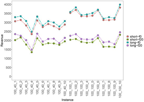 Figure 5 displays the revenue obtained. In this case, it is clear the effect of the fixed opening cost factor. The revenue obtained is smaller when the fixed opening cost is 20 compared with when it is 0. The effect of the length factor is minimal.