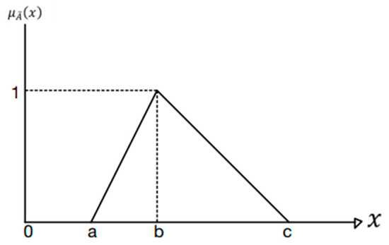A triangular fuzzy number, represented by , is a fuzzy set. Its membership function, , is as follows (see Figure 1) [,]: