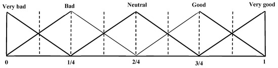 Linguistic variables are words or sentences in natural or human language that describe complex or ambiguous situations that cannot be expressed with crisp values []. In the context of decision-making, experts can readily employ linguistic variables to articulate their subjective perspectives in a comprehensive manner. To illustrate, the membership functions of five linguistic variables are presented in Figure 2. The triangular fuzzy number representing the linguistic variable “good” is expressed as (0.5, 0.75, 1.0).