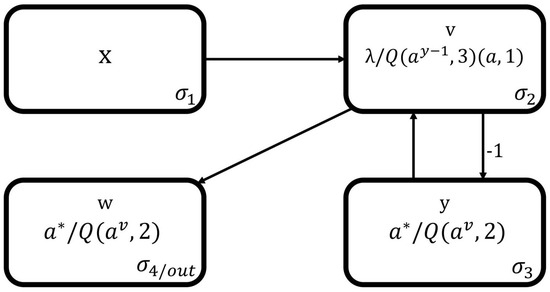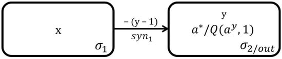 At the first simulation step, neuron extracts q spikes, where q is the minimum value between x and y. Therefore, neuron applies the the first rule, , when ; otherwise, the second rule is applied, . In the next simulation step, neuron extracts all spikes from neurons and . After that, no other rules can be applied. At this simulation step, the system stops. In this manner, the neural subtractor circuit is obtained, and the result is stored in neuron .