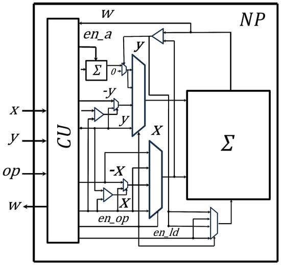 Once the neural arithmetic circuits were carefully analyzed and compared with those of existing approaches, we designed a customized digital architecture to mimic the neural behavior of the proposed arithmetic circuits, as shown in Figure 5. We employed conventional combinational and sequential logic circuits, such as an adder, multiplexers, comparators, and a counter to create a compact and high-speed neuromorphic processor, . Here, we mainly use a control unit, , and multiplexers to create a multi-arithmetic circuit implemented in 64 bits; i.e., this processor performs four arithmetic operations of two positive integers, x and y, by enabling their respective operation code, , (00 → addition, 01 → subtraction, 10 → multiplication, and 11 → division). Additionally, we incorporate an adder with a load enabled, , to execute the request rules, . This allows spikes to be transferred from the registers of the CU to the adder according to the specific operation. Additionally, we use a second adder to obtain the quotient. This occurs when the signal is enabled. Finally, the result is provided via the output w. On the other hand, this strategy has enabled us to perform four arithmetic operations using a simple adder as the main processing core. To prove their performance, we implement the proposed in a low-cost and low-area Altera Cyclone IV EP4CE22F17C6N FPGA. In addition, we implemented an existing processor [] to achieve a coherent comparison since both neuromorphic processors can perform four operations using dynamic multiplexing connectivity.