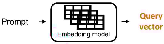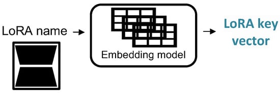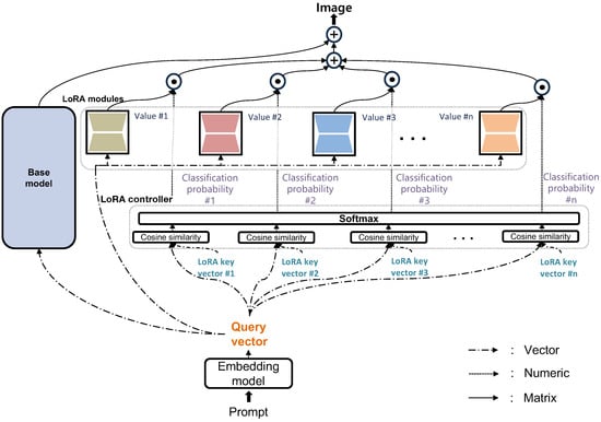 The first step in the inference of the proposed method involves converting the input prompt into a query vector Q, as shown in Figure 3, capturing the semantic content of the prompt in a form suitable for comparison with the LoRA modules. The prompt is processed using an embedding model, mapping the textual prompt to a high-dimensional embedding space to achieve this. The resulting vector Q represents the contextual and semantic information in the prompt, allowing it to be compared with the LoRA key vectors, Ki, of the LoRA modules. This transformation ensures that the prompt is encoded to retain the meaning and intent necessary for selecting the most relevant LoRA modules. A robust embedding model for this conversion step ensures that even complex or subtle prompts are accurately represented, providing a reliable basis for the similarity calculations.