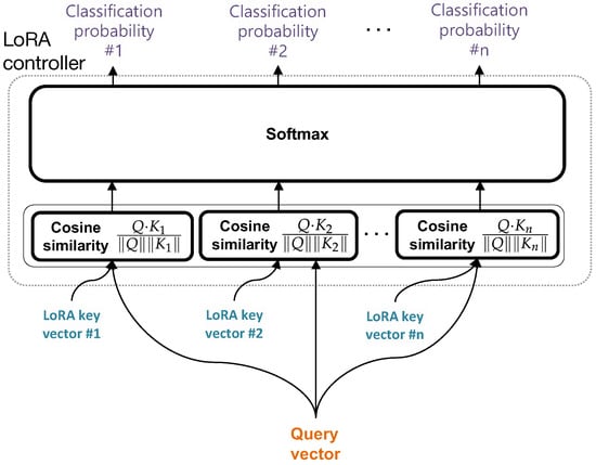 With the LoRA key vector K and query vector Q established, we proceed to the step of comparing these vectors to determine the most relevant LoRA modules for the prompt. The cosine similarity between query vector Q and each LoRA key vector measures how relevant each LoRA module is to the prompt. Cosine similarity allows the proposed method to prioritize LoRA modules whose semantic space aligns more closely with the task described by the prompt by focusing on the angular relationship between vectors, as shown in Figure 4. Cosine similarity is computed as the dot product of two vectors, normalized by their Euclidean norms; this normalization of vector magnitudes allows the measure to focus exclusively on the angle between vectors. Furthermore, cosine similarity is computationally efficient [19]. This focus on the angle is essential for capturing semantic similarity in high-dimensional spaces [20,21]. In this paper, cosine similarity prevents models with larger magnitudes but less relevance from dominating the merged model, ensuring that the final composition more accurately reflects the task.