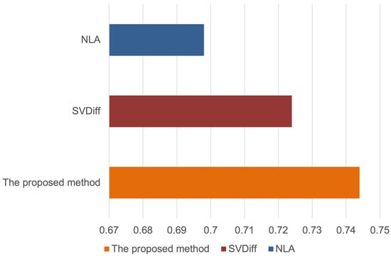 Table 5 and Figure 6 reveal that the proposed method outperformed SVDiff [12] and NLA in terms of text–image alignment and image similarity. Specifically, the proposed method achieved a text–image alignment score of 744, representing a significant improvement over SVDiff at 0.724 and NLA at 0.698. These results demonstrate the ability of the proposed method to effectively combine pre-trained LoRA modules without requiring additional fine-tuning, while dynamically adapting to the user prompt to produce semantically accurate and visually coherent images.