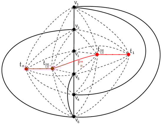 - Let . If the cycle separates only one vertex of graph (vertex of degree three), then the same idea as in Case 1 can be also used. Now, let the cycle separate two vertices of graph . One vertex of degree two and his neighbor (vertex or ). Thanks to Lemma 2, together with three crossings on , we have crossings in D. We need a dispute between at least four more crossings. If , we have at least n more crossings, which contradicts the assumption (7). Finally, let . In this case, (see Figure 2), and by Lemma 6, there is at least one vertex located in a different region of , , such that . We also have a contradiction with the assumption (7).