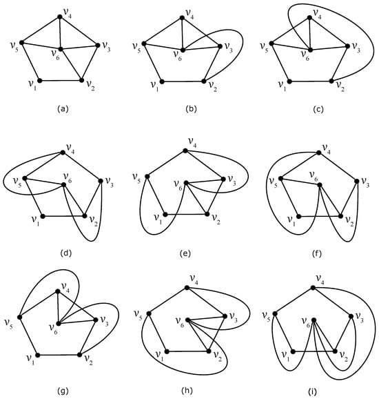 By Lemma 5, we deal with possible subdrawings of induced by D in which the set is nonempty, i.e., there is a region of incident with all six vertices of . At first, we consider the subdrawing with the vertex notation given in Figure 2g. Let be a subgraph from the nonempty set , that is, the subgraph is represented by . Because all vertices of lie in the same region of , it is easy to verify over only all six possible regions of that the edges of must be crossed by each of the remaining subgraphs at least five times. Thus, by fixing the subgraph using (3), we obtain