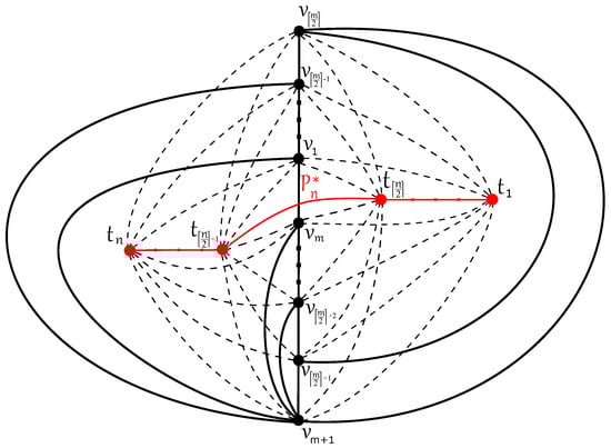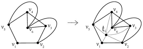 For all integers , the upper bound for Conjecture 1 can be reached by removing the edge from the drawing in Figure 5, because is crossed by each subgraph on the left side exactly times. Note that for , the optimal drawing of with crossings cannot be obtained by removing the edge for n odd and at least three. This special situation is first caused by the fact that the wheel is isomorphic to the complete graph ; see also Klešč and Schrötter [].