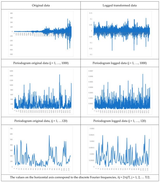 Initially, we set m = 5 and obtained j1 = 1, as one would have expected in view of the periodograms displayed in Figure 1. The estimated value of d1 is then 1, which is consistent with the results of standard unit root tests ([,,,,]. We also allowed for fractional integration by estimating the equation (1 − L) × (t) = u(t) instead of imposing (4). The results support the unit root null hypothesis, with values of d equal to 0.981 and 0.992 for the original and log transformed data, respectively, with the corresponding 5% confidence intervals being (0.972, 1.009) and (0.983, 1.017). Next, we focus on the first differenced log values, in this case setting m = 4 and finding an order of integration not significantly different from zero; finally, we set m = 3.