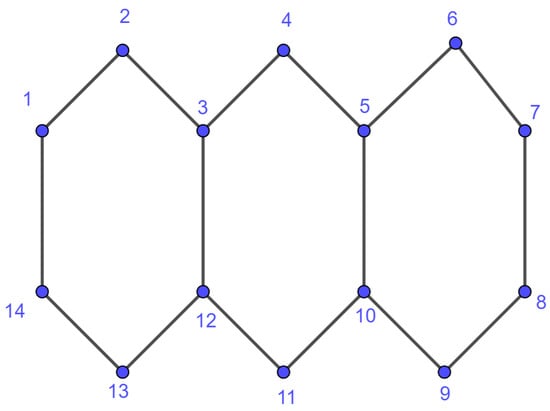 In this subsection, we will illustrate an example of a Laplacian and its LDU factorization taking a well-known example from chemistry. We considered the polycyclic graph associated with a molecule of anthracene corresponding to Figure 1.