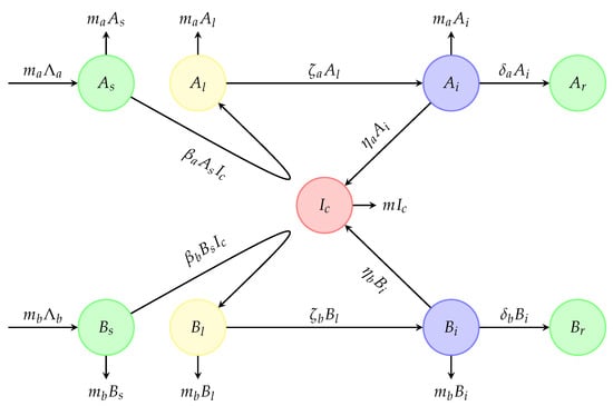Let us consider two beehives (A and B) sharing the same natural space, where each colony is subdivided into four classes as follows: