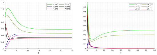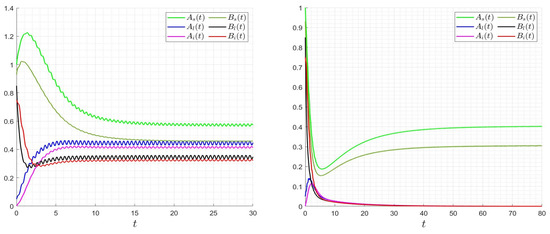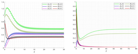 Behavior of trajectories of model (3) for the case where and , and thus (left), and for the case where and , and thus (right).
