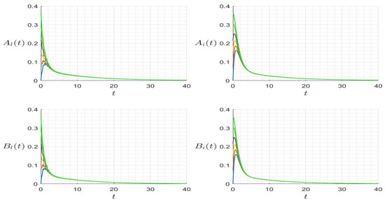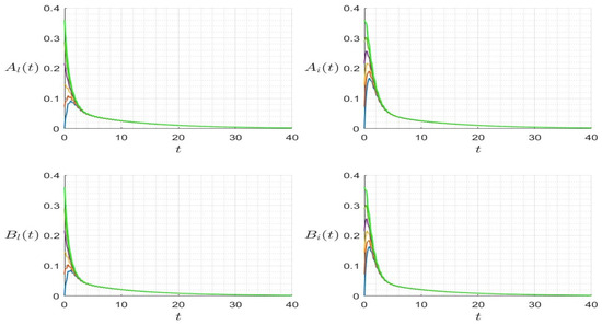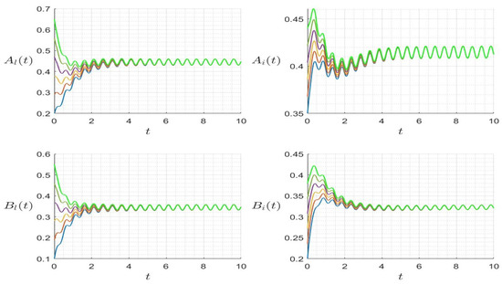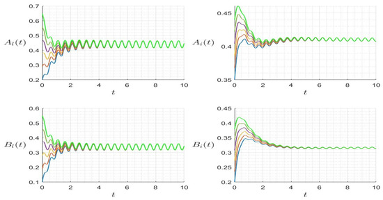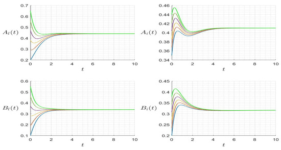 In Figure 2 (left), we provide the trajectories where and , such that . The solution converges to the endemic steady state. However, in Figure 2 (right), we consider a set of parameters and , such that . The trajectory converges to the HIV-free steady state . In Figure 3, we provide the trajectories for several initial values, which converge to the same endemic steady state for the case where and , and thus . In Figure 4, we provide the trajectories for several initial values which converge to the same Nosema disease-free steady state for the case where and , and thus .