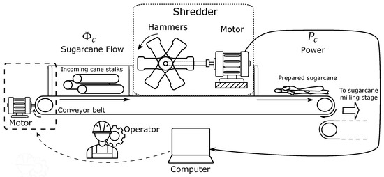 Schematic diagram of sugarcane preparation stage and the shredder. The sugarcane flow is handled by a conveyor belt. The shredder uses an electric motor and hammers to prepare the incoming sugarcane flow. The power required by the motor is measured. The prepared cane is conveyed to the milling stage.