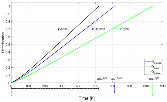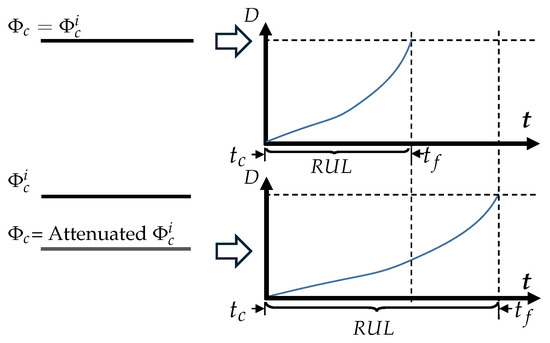 It is assumed that can be estimated at any time from the estimation of the current and its simulated trajectory within a horizon until an acceptable threshold before failure. For this simulation, (current deterioration) and a prediction model are needed. From this point, the model can be run with a regular input such as a step input. This regular input must be a representation of a feature extracted from the data. For example, the amplitude of the step can be the average of the past data, or the minimum value, or the maximum value, or all three values. It is also assumed that in the prediction of the trajectory of , operation conditions remain unvarying along the given horizon from until (the estimated threshold time).