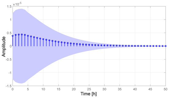 This also means that it is expected that the real trajectory is more likely to be closer to the predicted one with the main value of . As shown in Figure 13, the real trajectory can be expected with a high probability to be within the zone delimited by the simulated pessimistic and optimistic trajectories. Similarly, it is possible to deterministically take as the estimate corresponding to the mean value of the amplitude.