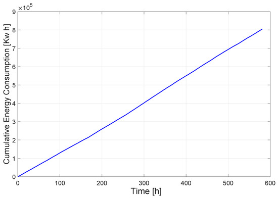 is measured directly using the instrumentation of the shredder motor. The energy consumed by the process is computed every 1 h. Therefore, 1 h is taken as the step time for data analysis. The cumulative energy consumed by the preparation process stage for the lifetime is approximately 805.51 MWh. This value is useful to provide an energy deterioration threshold reference (see Section 4.2). Remark that, according to Section 2.1, the total weight of the 164 hammers will decrease from approximately 4264 kg (26 kg each) to 4100 kg (25 kg each).