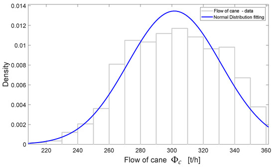 Distribution fitting for the incoming sugarcane flow data. A normal distribution fitting is used.