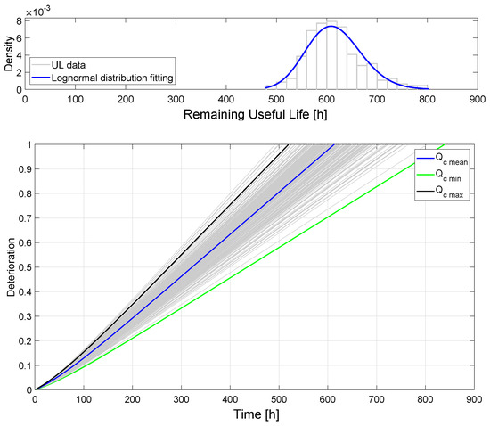 Figure 13 shows the resulting deterioration corresponding to 233 randomly generated amplitude step inputs, with a normal distribution function, with mean value = 301.56 and a standard deviation = 29.6501. From this simulation, it can be observed that the simulated deterioration trajectories at , assuming invariant conditions over the prediction horizon, are within the limits defined in Figure 11. In addition, the distribution of the RUL values (equivalent in this case to the total useful life) obtained is shown at the top.